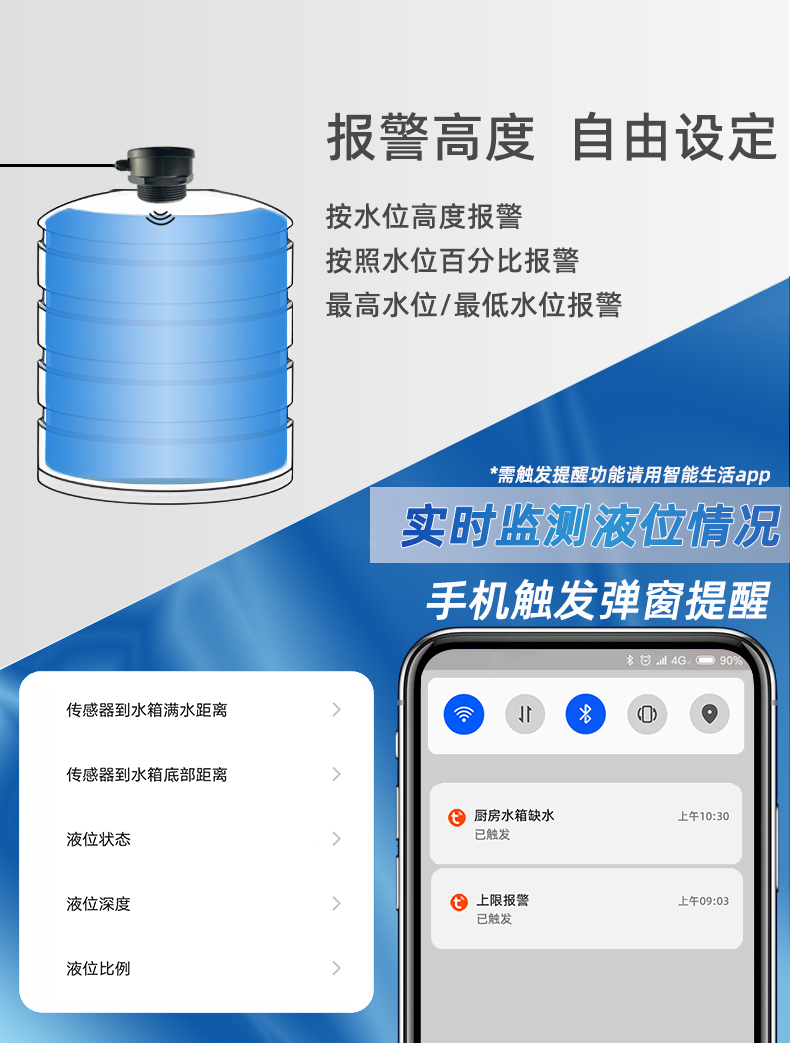 產(chǎn)品型號(hào):Smart TLC 2206 水塔水量檢測(cè)儲(chǔ)罐井下水箱液位實(shí)時(shí)監(jiān)測(cè)涂鴉連接手機(jī)液位遠(yuǎn)程查看